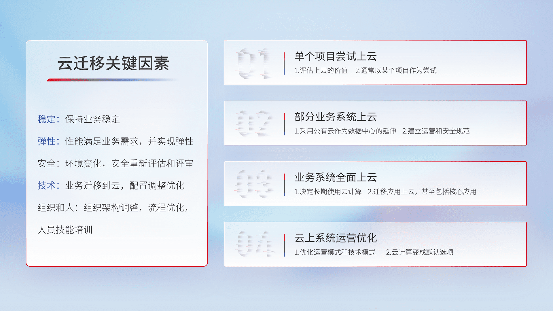 结合实际业务,,从规划设计、、、云平台选型、、云原生改造、、、、数据迁移、、、、集成交付,,,迁移全过程为客户识别最佳上云路径,,,做好风险识别管理,,,,设计网络架构、、、、身份权限、、、、安全审计合规、、、操作审计、、、、日志审计、、、、监控告警策略、、、、多站点容灾设计等,,对云上基础设施进行整体规划,,,提升IT治理水平,,以满足弹性、、高可用、、、、高性能的需求。。。