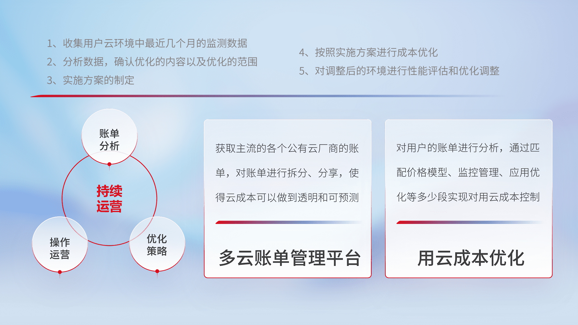 通过多云纳管,,,以统一的资源数据模型把客户的云资源进行抽象和封装,,,进而实现对多云资源的统一操作,,,,保障云资源管理的可靠性、、、稳定性与可用性。。。量身定制化运维内容,,,配置、、开发运维、、、、补丁管理、、、、备份、、、监控、、、、认证和访问管理、、审计和日常巡检等,,,保障在用云过程中的可靠度,,稳定度以及高可用率。。。