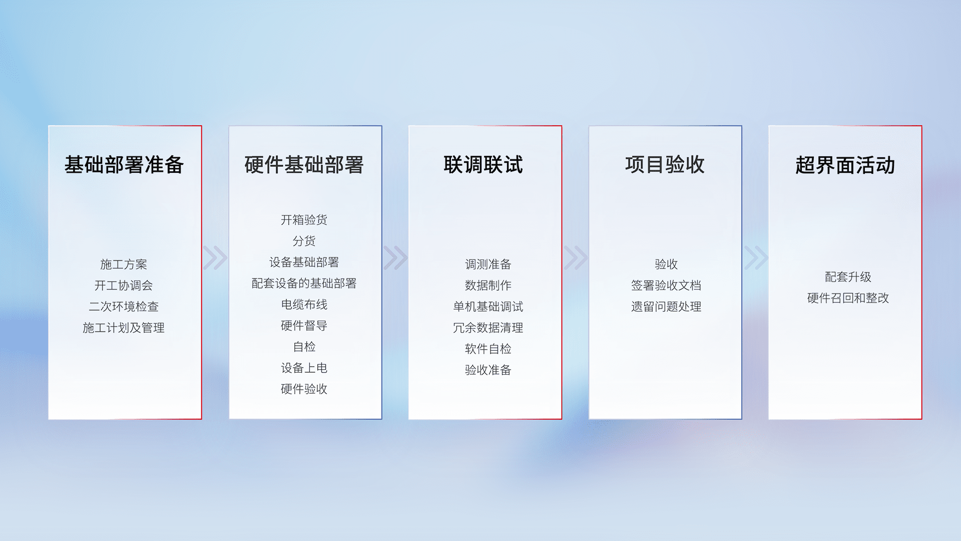 从基础部署准备、、、、硬件基础部署、、、联调联试、、、、项目验收、、、越界面活动的全过程可追溯,,保证施工质量和进度。。。